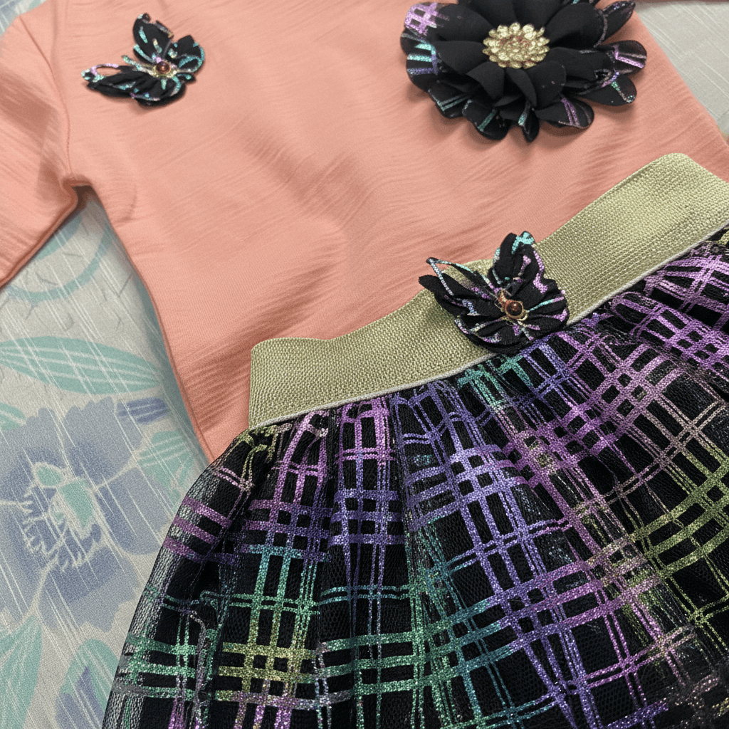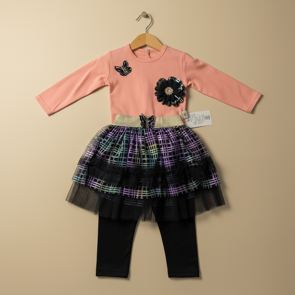 Make your little one shine in this adorable and stylish 3-piece outfit set. This charming ensemble features a soft peach full-sleeve top adorned with elegant floral and butterfly embellishments, paired with a trendy black tutu skirt layered with colorful rainbow shimmer detailing. The outfit is completed with comfortable black leggings and a matching headband for a perfectly coordinated look.