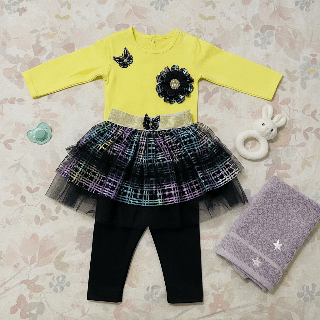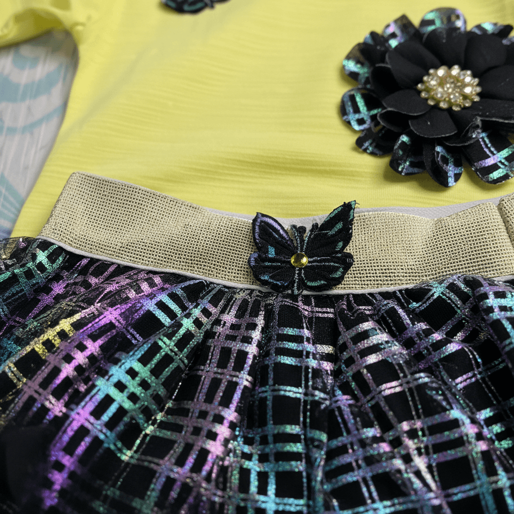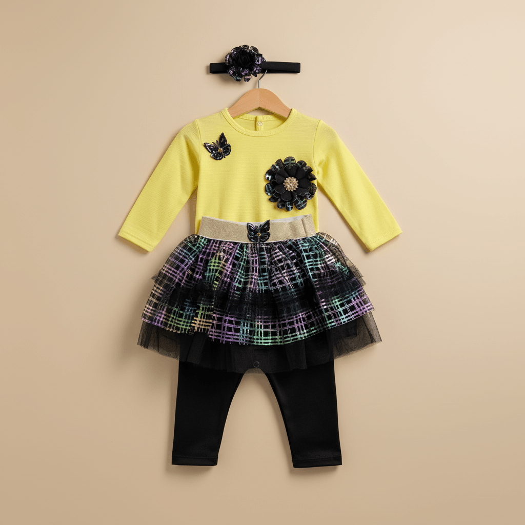 Brighten up your little girl’s wardrobe with this vibrant and stylish 3-piece outfit set. This adorable ensemble features a soft yellow full-sleeve top decorated with elegant floral and butterfly embellishments, paired with a trendy black tutu skirt highlighted with multicolor rainbow shimmer patterns. The set is completed with comfortable black leggings and a matching headband for a perfectly coordinated look.